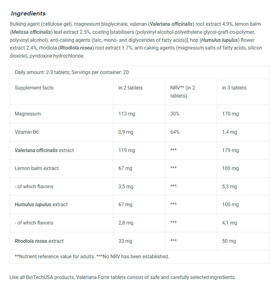 Nom du produit : BioTechUSA – Valeriana Forte – 60 tablets