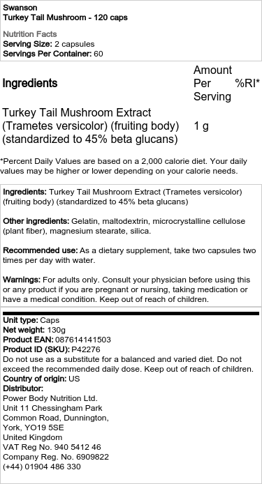 Renforcez les défenses de votre corps au niveau le plus fondamental avec le pouvoir protecteur du champignon Turkey Tail. Les herboristes traditionnels chinois et japonais considèrent le Turkey Tail Mushroom comme un tonique puissant pour le système immunitaire et la fonction hépatique. La science moderne a révélé que le Turkey Tail Mushroom contient des composés polysaccharides qui soutiennent les défenses de l’organisme au niveau cellulaire. La teneur en bêta-glucane de notre extrait de Turkey Tail Mushroom est garantie à 45% pour une puissance garantie dans chaque capsule.