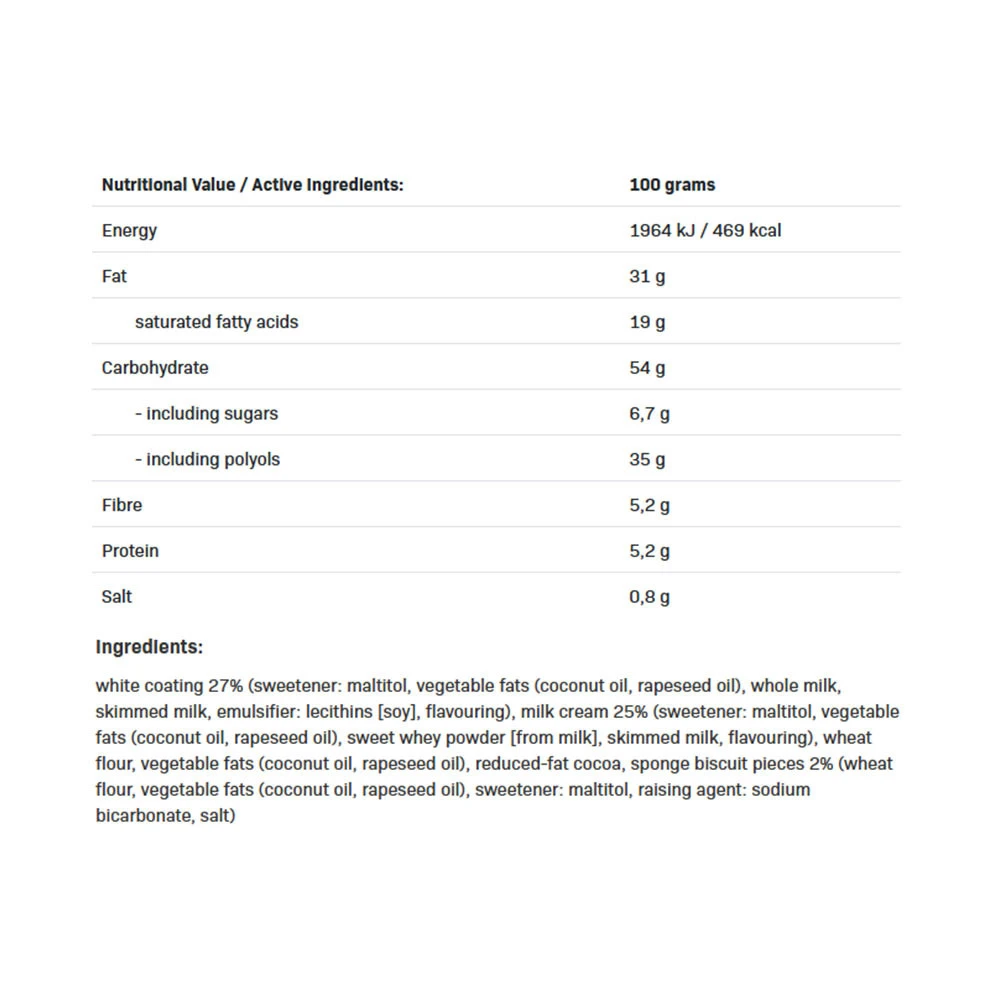 Farine de blé, protéines de lait, édulcorant (maltitol), huile de palme, émulsifiant (lécithine de soja), arôme, poudre de cacao maigre, sel, poudre à lever (bicarbonate de sodium).