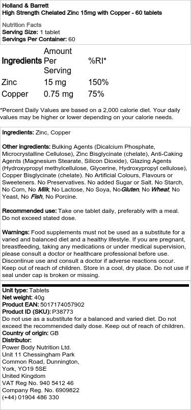 Holland & Barrett – Zinc chélaté haute puissance 15mg avec cuivre