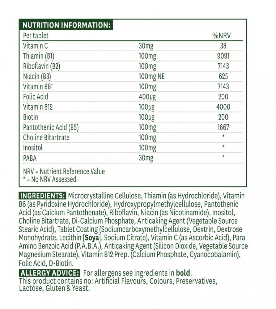 Ingrédients principaux : Ce complexe inclut un ensemble de vitamines B, soigneusement sélectionnées pour leur origine naturelle. Chaque tablette est formulée sans ajout de substances artificielles, respectant ainsi la naturalité des composants.
