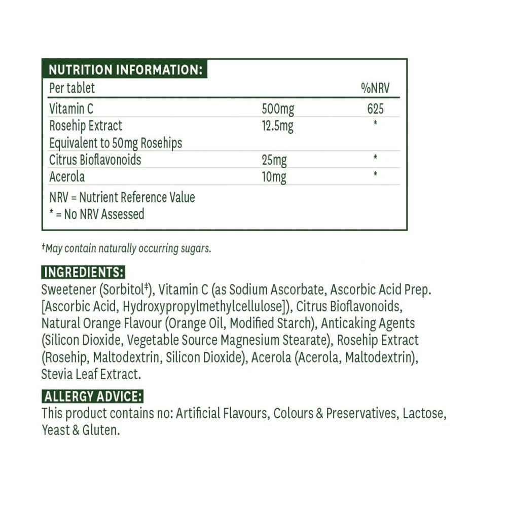 Ce produit est formulé à partir de vitamine C, connue pour sa pureté et son origine naturelle. Les ingrédients sont soigneusement sélectionnés pour maintenir la qualité supérieure que Natures Aid s’engage à offrir.