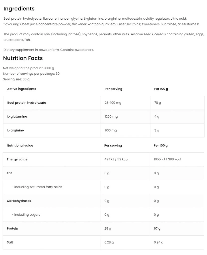 - Ingrédients principaux : Protéines extraites du bœuf