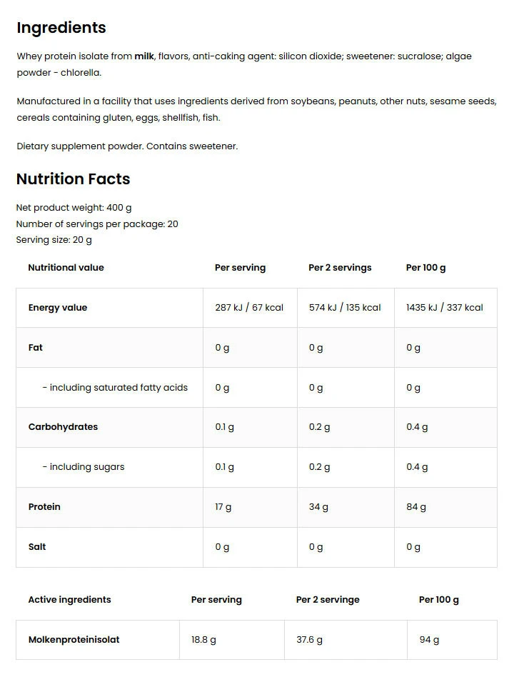 Isolat de protéine de petit-lait clair Ostrovit (400 g, Concombre et Menthe)