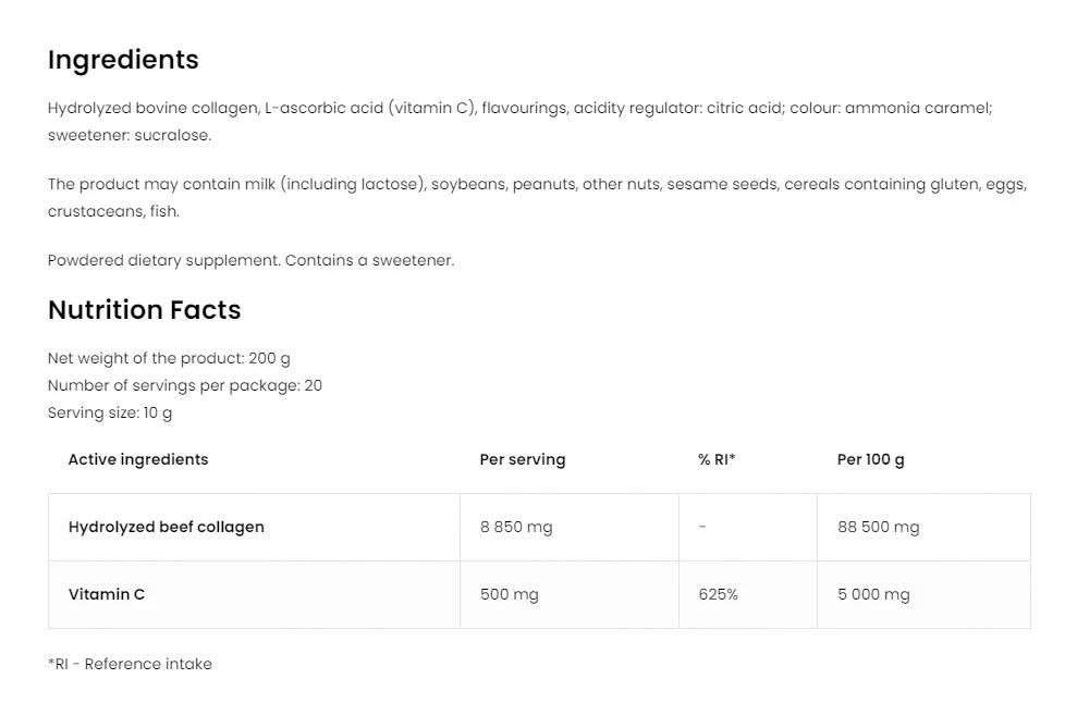 Ce complément contient du collagène et de la vitamine C, tous deux issus de sources soigneusement sélectionnées pour leur grande pureté. Ces composants sont intégrés sans ajout d’arômes artificiels, conservant ainsi leur qualité naturelle.