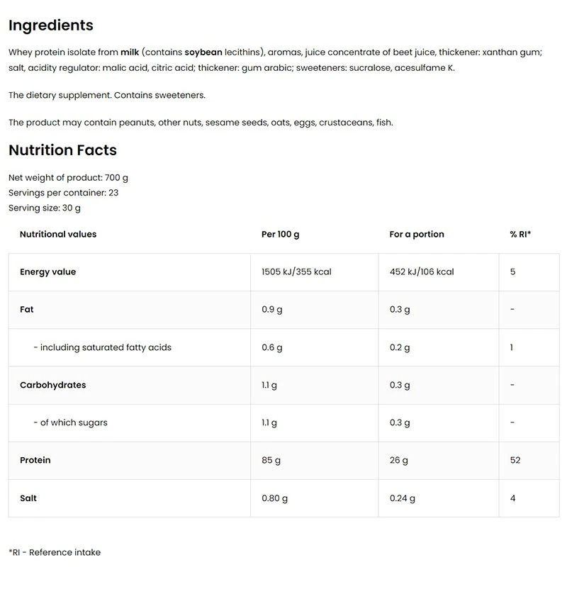 Ce paquet contient 700 g d’Ostrovit Whey Protein Isolate dans un emballage pratique,conçu pour maintenir la fraîcheur du produit.