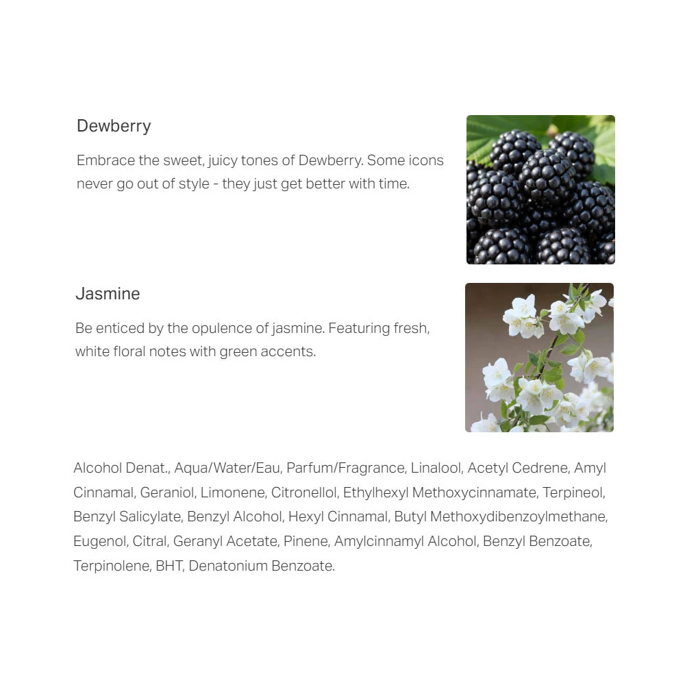 Ce produit est formulé à partir d’extraits naturels de baies de dewberry, connues pour leur parfum envoûtant. La composition inclut également des essences naturelles qui contribuent à la pureté et à l’intensité du parfum.