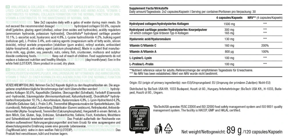 Offrez à votre peau, vos cheveux et vos articulations les nutriments dont ils ont besoin pour rester en bonne santé et jeunes avec le Hyaluronic and Collagen de BioTechUSA. Commandez dès maintenant et profitez d’une peau radieuse et d’une mobilité articulaire optimale !