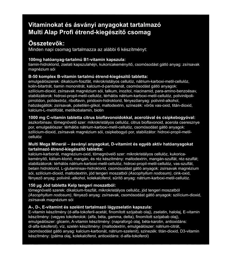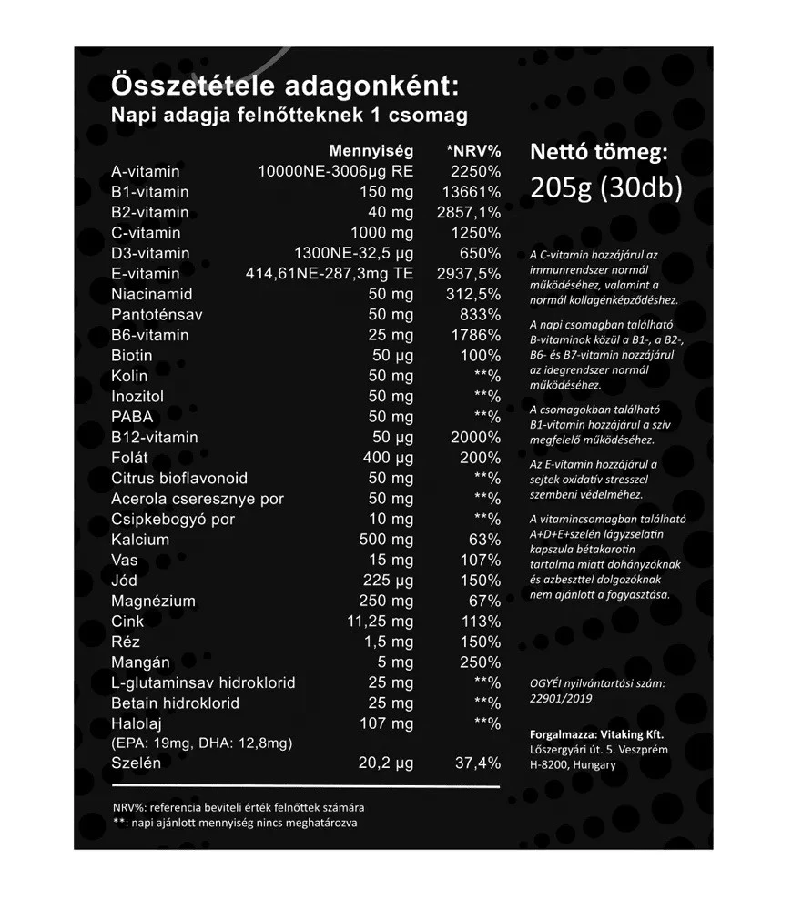 Le Vitaking Multi Profi Basic se distingue par sa facilité d’utilisation. Un seul pack par jour suffit,ce qui en fait un complément simple pour un usage quotidien. Son emballage individuel permet non seulement une conservation optimale mais aussi une grande praticité lors des déplacements ou dans le cadre d’une routine bien remplie.