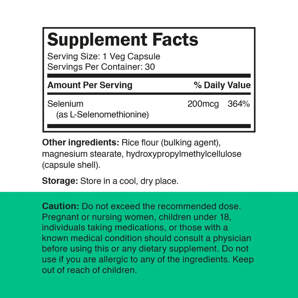 Ingrédients principaux : Chaque capsule contient 200 mcg de L-selenomethionine, une forme hautement pure et naturelle de sélénium.